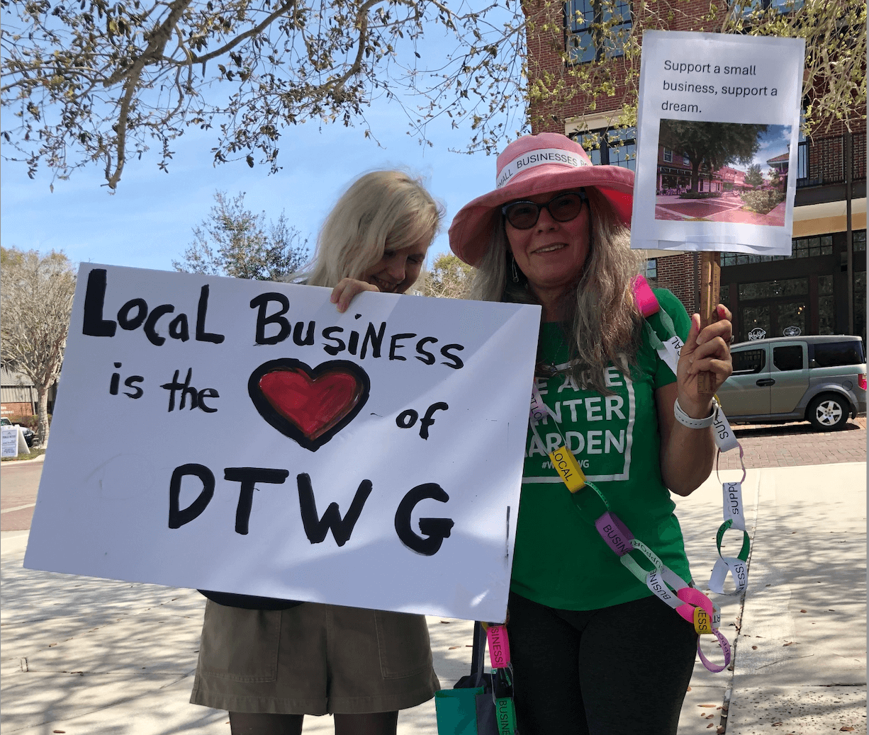 A small group of Winter Garden residents turned out Friday at Winter Garden’s clock tower to show support for local businesses — particularly four that recently lost their leases: Ruby & Rust, Driftwood Market, Polka Dotz and Three Birds Cafe. The group then walked to city hall where they dropped off envelopes with messages for the mayor, commissioners and city manager: protect and preserve the “uniqueness and charm of downtown Winter Garden.”